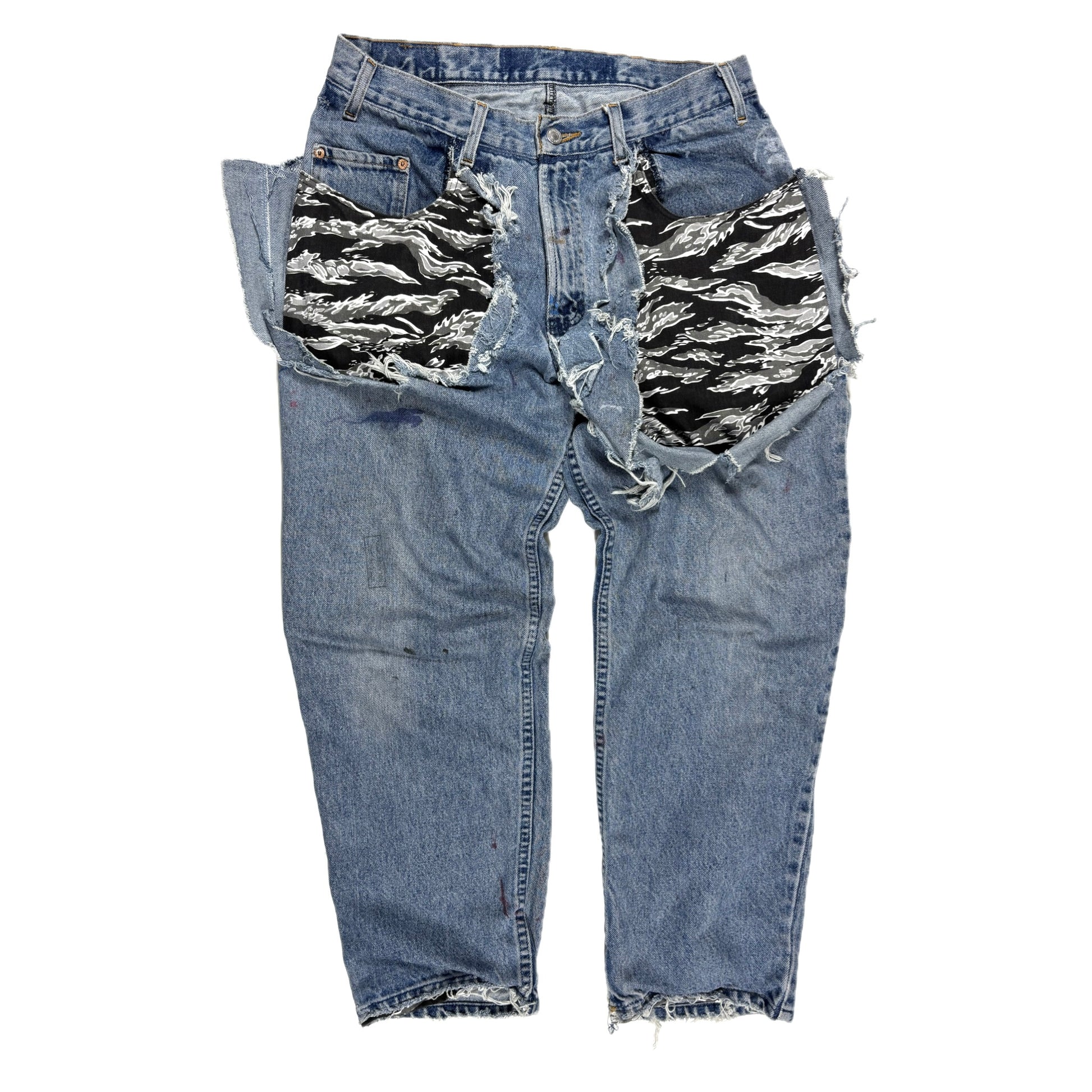 Reclaimed medium weight cotton denim , medium/light cotton twill layered tiger stripe screen printed