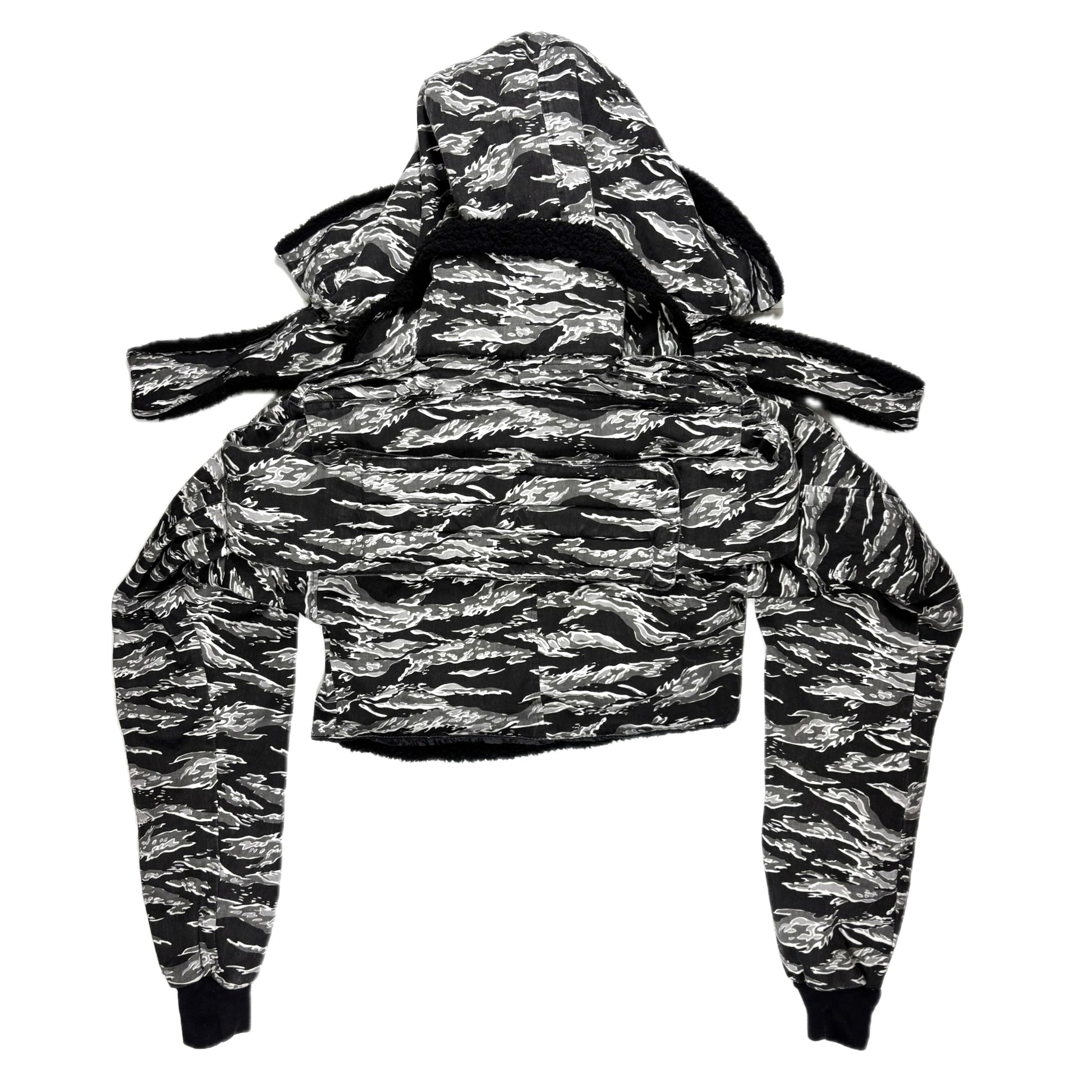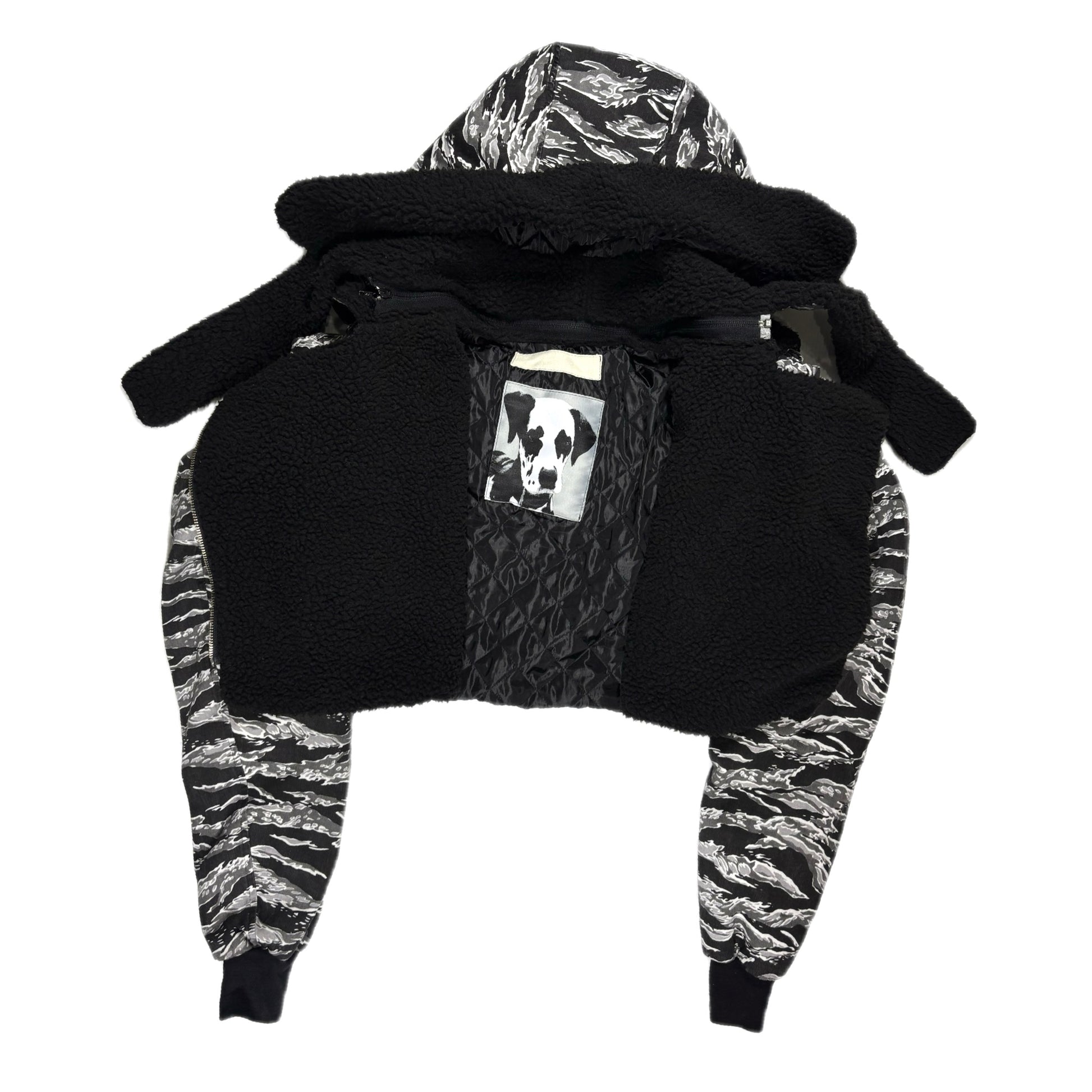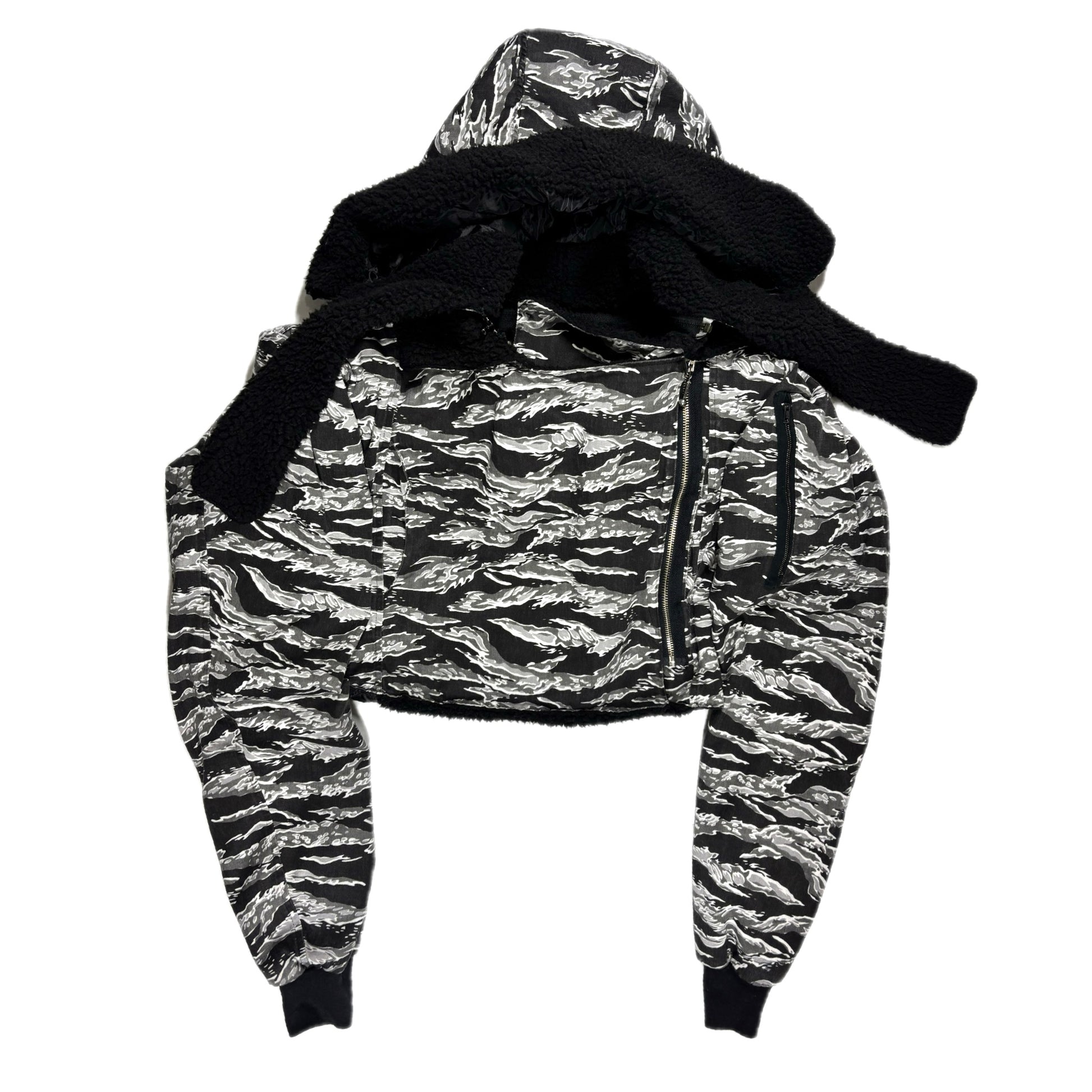 Medium/light weight cotton twill tiger stripe camo screen printed shell , black sherpa chest linning/ lightweight quilted polyester lining